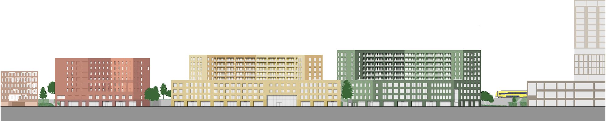 Aan de stadzijde toont het ensemble zich als een uniforme stadswand die in hoogte aansluit op de tegenovergelegen wijk Belcrum. Aan de tuinzijde vormen de gebouwen een getande coulissenwand van hogere driehoekige volumes die de spoortuin opdeelt in verschillende, onderling verbonden tuinkamers, vertellen de architecten.