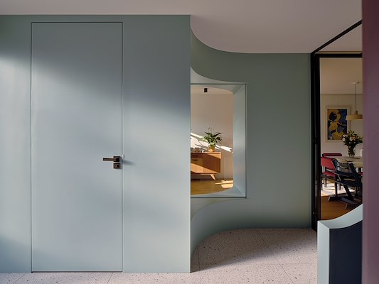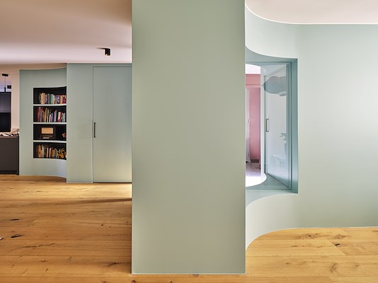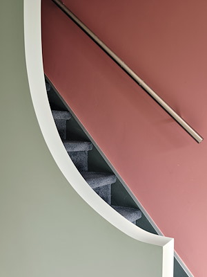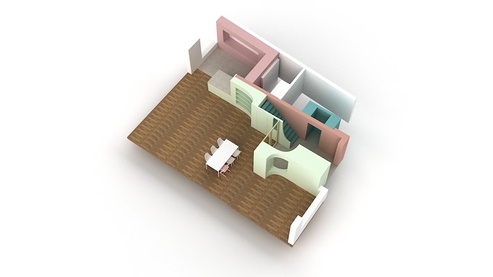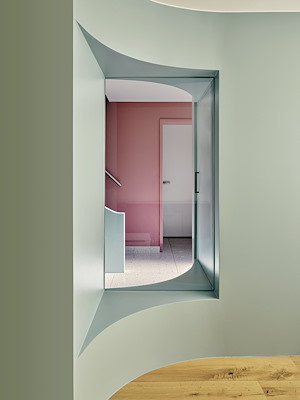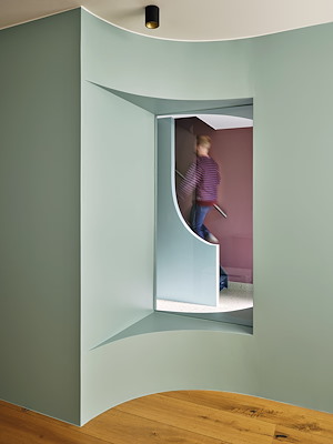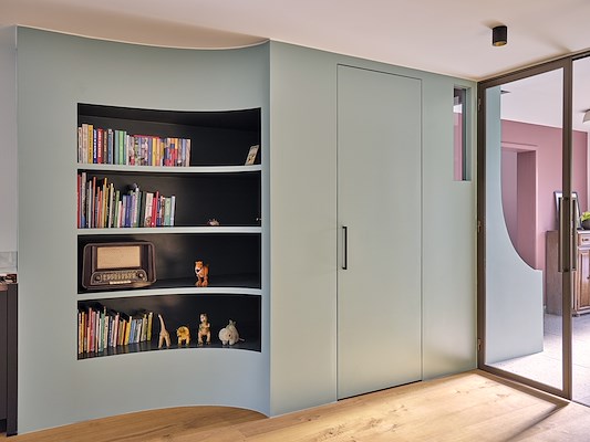 een kleurrijk en gelaagd interieur gekregen. Een verbindend volume met een vloeiende beweging, doorzichten tussen ruimten en uitgesproken kleuren staan centraal in het ontwerp ‘Curves, colours and cutouts’.