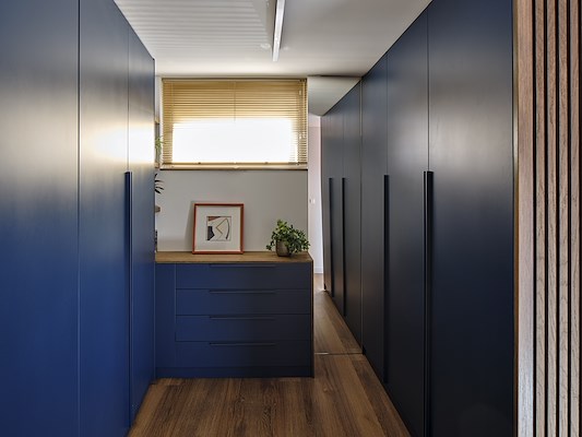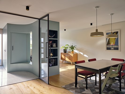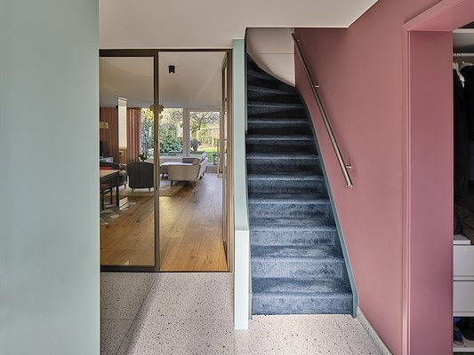De garage is verkleind ten gunste van extra (berg)ruimte. Ook steekt een compacte garderobe als nis in de garage, waardoor de entreehal zo ruim en opgeruimd mogelijk kan blijven. Een palet van uitgesproken kleuren voor de nieuwe elementen maakt het spel met volumes en doorzichten af.