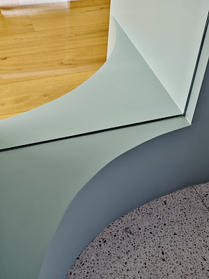 Rond de overgang van hal naar woonkamer lag een klein knelpunt. Hier bevinden zich belangrijke indelingselementen zoals de meterkast, leidingschacht, toilet en trap. Deze heeft Lagado Architects alle op dezelfde plek behouden, maar middels het sculpturale object tot een ruimtelijk geheel gemaakt. De gekromde lijnen verbinden de elementen op vloeiende wijze.