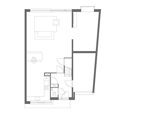 De keuken is van de voorzijde van de woning naar de tuinzijde verplaatst. De ruimte die daarmee aan de voorkant vrijkwam en nu dient als ‘speelkamer’, die visueel verbonden is met de hal via een raam. Tevens verbinden nu glazen deuren de hal met de woonkamer, zodat er bij het betreden van de woning een zichtlijn naar de tuin is. Met deze openingen dringt daglicht ook dieper in de woning.
