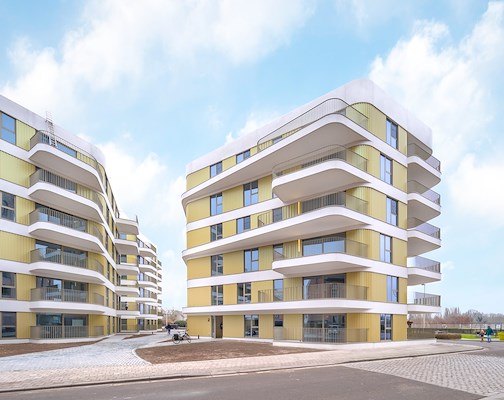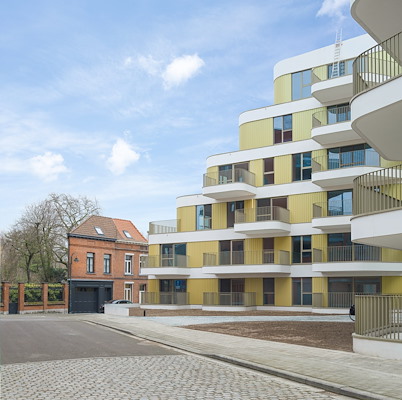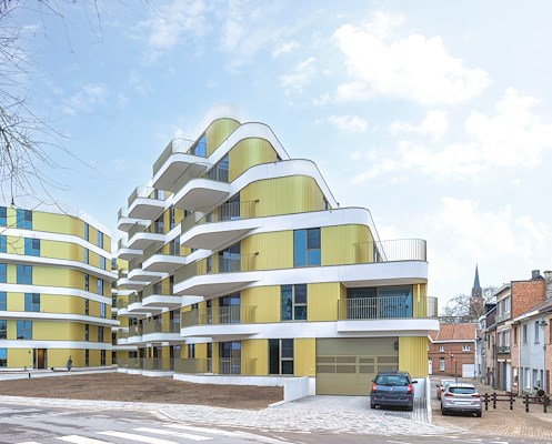 Daarbij wilde Binst Architects de oorspronkelijke publieke ruimte zoveel mogelijk respecteren en de privacy voor de appartementen waarborgen. De oplossing vond het bureau met de onverwachte configuratie voor de vier volumes in de vorm van een klavertjevier. Tussen de ‘bladeren’ strekt zich een plezierig open ruimte. Door de speciale vorm en de afgeronde hoeken van de volumes heeft elk appartement bovendien uitzicht op de Rupel, aldus het architectenbureau.
