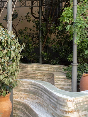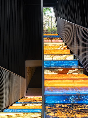 De ondergrondse en de buitenruimte zijn met elkaar verbonden via een volume uit hemelsblauw onyx, dat een trap in divers tinten gekleurd steen bevat.