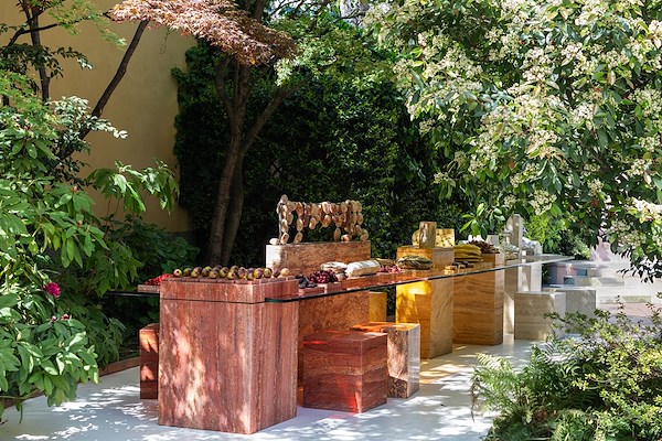 In de tuin zijn natuurstenen meubels en objecten te zien, die op uitnodiging van OMA zijn ontworpen door Sabine Marcelis, Studio Ossidiana, Bita Fayyazi en Ward Strootman. Zo ontwierp Marcelis de opvallende zeven meter lange tafel, in samenwerking met āfood designā Laila Gohar voor de presentatie van etenswaren.