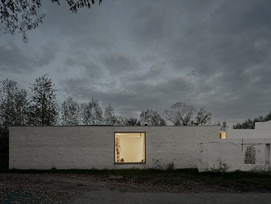 Zo zijn kleine ‘doorkijk’-openingen ontstaan, maar het gevoel dat de leefruimte dicht bij de rijweg ligt en de rechtstreekse inkijk zijn verdwenen, leggen de architecten uit. Het litteken van de afgebrande hoeve draagt bij aan afscherming van het nieuwe woonhuis voor blikken vanaf de straat.