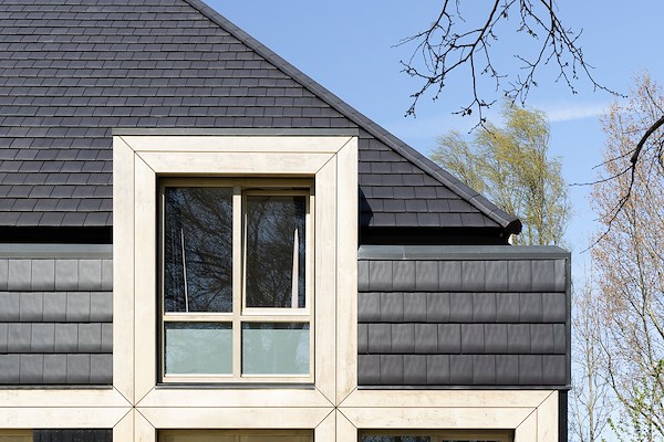 Op de gevels is een gebintenstructuur zichtbaar van blank Accoya hout. De gebintvakken zijn gevuld met grote ramen of zwarte latten, of een combinatie daarvan. Het dak is bekleed met zwarte keramische dakpannen. Het dak en de gevel sluiten bovendien op elkaar aan doordat de dakpan over de gevel doorloopt en stopt ter hoogte van het houten raamwerk.