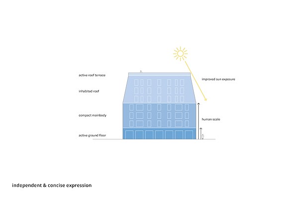 De vier typologieën zijn alle over de drie bovenste verdiepingen afgeschuind, waardoor een dakrand ontstaat boven de vierde of vijfde verdieping. Dit zorgt zoor zowel een menselijke schaal van het als veel daglicht in de openbare ruimten en appartementen. Met tevens een andere materialisatie op de begane grond zijn de gevels visueel gestructureerd in drie lagen: begane grond, rechte gevel en schuin dak.