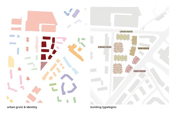 De nieuwe wijk kent vier verschillende gebouwtypologieën: het atriumhuis, het lineaire huis, het punthuis en het tweelinghuis. Elke typologie wordt twee keer toegepast, waardoor koppels ontstaan die door hun opstelling en oriëntatie binnen het plan met elkaar lijken te ‘dansen’. Het beperkte aantal gebouw- en woningtypologieën zorgt voor samenhang en optimalisatie, en een balans tussen herhaling en variatie.