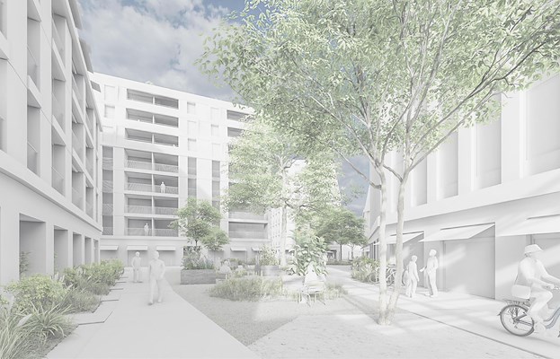 Tussen de vier ‘dansende koppels’ komen weelderig met bomen beplante binnenplaatsen en autovrije straten. Gebieden voor de gebouwen fungeren als buffer tussen het publieke en privédomein. De schaduwrijke ruimten, voorzien van beplanting, hebben een eigen microklimaat en dienen ook als retentiegebied voor overtollig regenwater en ter afkoeling.