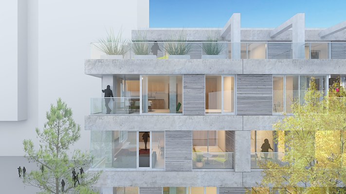 Het nieuwe gevelbeeld is geïnspireerd op het bestaande, maar breekt met het monotone karakter en er ontstaat voor loggia’s en terrassen voor de woningen op de bovenste laag. In een deel van het gebouw worden twee lagen samengevoegd, waardoor een transparante plint met de hoofdentree kan worden gerealiseerd. Hier bevindt zich ook de commerciële ruimte.