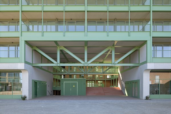 Het industriële karakter zit hem vooral in het materiaalgebruik (staal, beton) en elementen zoals de vakwerken boven de entreepoort. De afgeronde hoeken, de frisse groene kleur en de openheid van het gebouw verzachten de uitstraling. Centraal in het gebouw ligt een verhoogde binnenplaats, die is omgeven door houten gevels van de woningen rondom.