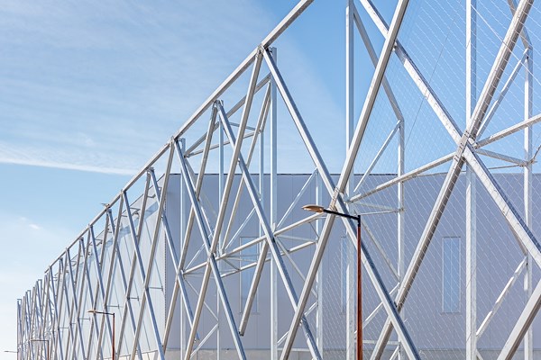 Het rondom lopende natuurscherm zorgt ervoor dat een eenduidig XL-gebouwvolume ontstaat dat enerzijds aansluit bij de ambities uit het beeldkwaliteitplan en anderzijds de mogelijkheid geeft om het gebouw logistiek en energetisch efficiënt te positioneren. Doordat het natuurscherm zich als een tweede schil rondom het daadwerkelijke gebouwvolume vouwt, kunnen ook de docks aan de snelwegzijde en de benodigde parkeerplaatsen aan het zicht worden onttrokken, legt Heembouw Architecten uit.