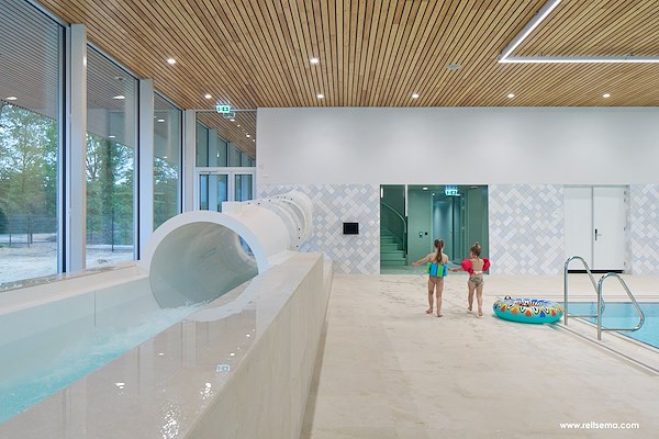 Reitsema & partners maakte een tijdloos ontwerp aan de hand van drie speerpunten die zich laten vangen in de omschrijving: een fris zwembad met uitnodigende horeca met het landschap als leidende factor. De relatie tussen binnen en buiten is versterkt door het gebruik van lichte kleuren en materialen in combinatie met grote glazen puien.