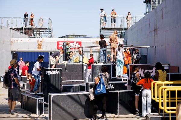 Een van de bakken van het drijvende festivalhart is volledig ingericht voor urban sports zoals skateboarden, freerunnen, voetbal en dans. Naast een skateramp staan hier verschillende bijzondere objecten uit de haven waarmee urban sporters zich helemaal sportief kunnen uitleven. Tijdens de