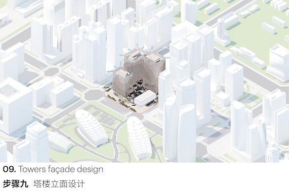 De drie kantoortorens gaan dankzij subtiele en elegante detaillering op in de omringende torens. Schaduwstudies van de omliggende gebouwen zorgen ervoor dat precies kon worden vastgesteld wanneer de zon op welk deel van het complex zou schijnen. Met deze informatie als uitgangspunt heeft het team het gevelontwerp verfijnd met vinnen die schaduw creëren. De achterkant van deze vinnen bevatten te openen panelen waardoor de kantoren deels natuurlijk kunnen worden geventileerd. De verwachting is dat de torens hiermee minder energie zullen verbruiken dan complexen van vergelijkbare omvang.