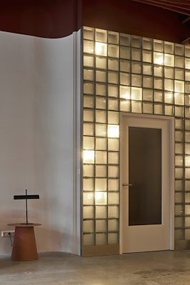 Hart van de loft is het keukeneiland, geplaatst tussen twee betonnen kolommen en uitgevoerd met blauwe tegels. Het vormt een stevig element, nodig in deze grote ruimte, legt Kumiki uit. Om het betonnen casco te doorbreken en licht te brengen in de middenzone is hier een wand van glazen bouwstenen geplaatst. Achter de wand zijn op willekeurige plekken lichtpunten aangebracht.