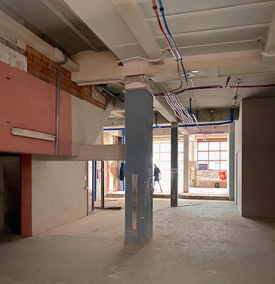 Ook de leidingen langs het plafond zijn in het zicht gehouden. Het plafond en de leidingen zijn in een warmrode kleur gespoten, wat ‘gewicht’ en warmte geeft aan deze ruim 4 meter hoge ruimte.