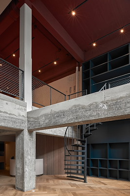 Alle ruimten vloeien zoveel mogelijk in elkaar over. Een stalen wenteltrap en loopbrug verbinden de beide niveaus van de loft met elkaar en met de straat. Een grote blauwe kast vormt in de vide eveneens een verbindend element; de kastwand is een groot ruimtelijk gebaar dat past bij de schaal van het geheel.