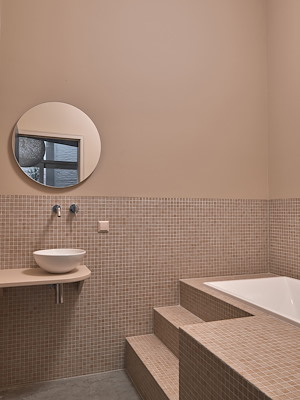 Als contrast met de ongepolijste uitstraling van het beton heeft Kumiki ook ronde vormen en natuurlijke materialen toegevoegd. De cilinder op de verdieping is de douche. Het element is los van het plafond en de muur geplaatst zodat licht er langs schijnt en de houten bekleding geeft een warme uitstraling.