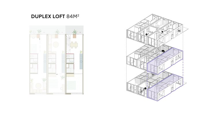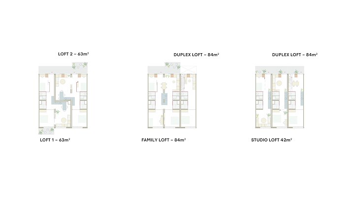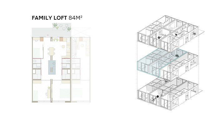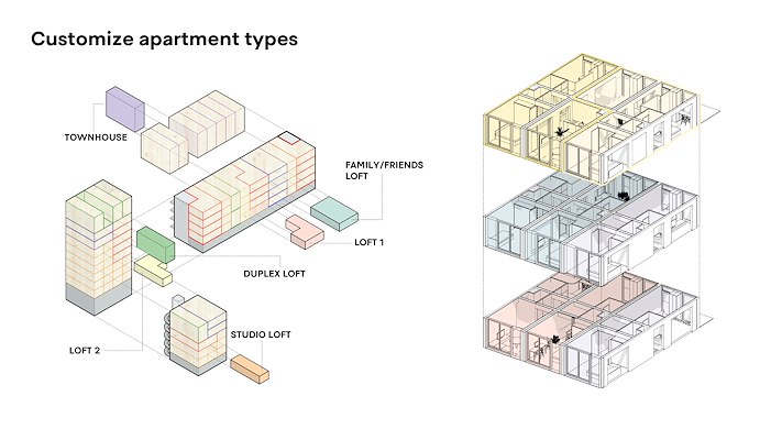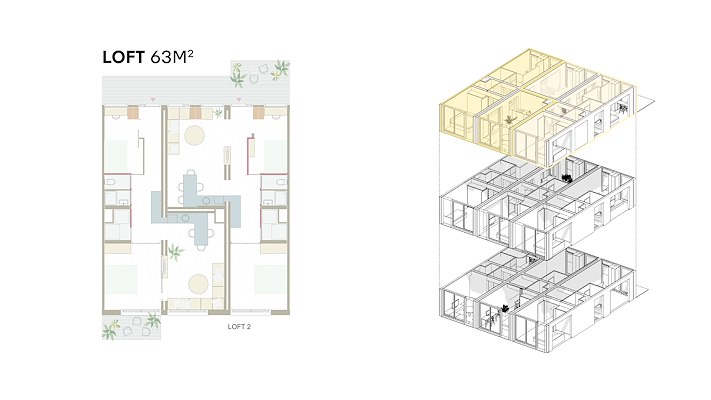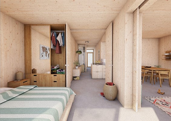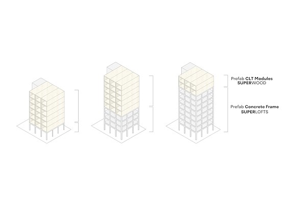 “Superwood stelt ontwikkelaars in staat om supersnel en eenvoudig de ideale mix van appartement-types en indelingen te creëren, door gebruik te maken van een bibliotheek met modulaire units”, stelt het bureau. “De super compacte en efficiënte Superwood loft van 63m² bevat twee slaapkamers, een ruime woon- en eetkamer met veel daglicht en wijds uitzicht en kan in een comfortabele houten afwerking of met stucwerk geleverd worden. Ook grotere appartementen zoals een family- of friends-appartement met drie slaapkamers van 84m², een duplexappartement of een compacte studio loft van 42m² zijn mogelijk.”