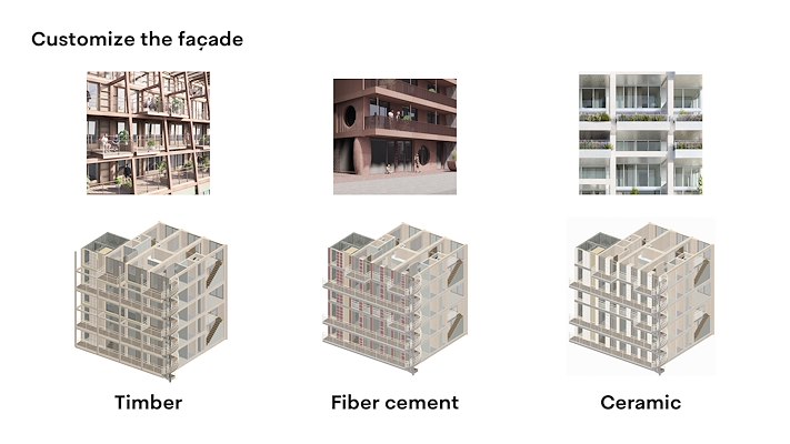 De modules waarmee gewerkt wordt hebben massief houten wanden en vloeren, uit CLT, met lichtere tussenwanden. De modules worden in de fabriek gemaakt en op locatie op elkaar gestapeld. Tot nu toe werkt het architectenbureau vooral met units (3D), maar het is ook mogelijk om met elementen (2D) te bouwen, benadrukt het architectenbureau.