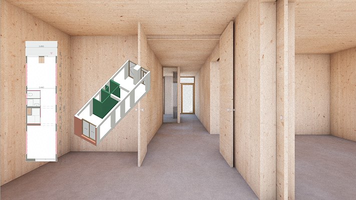 ontwikkeld waarmee in korte tijd een modulair houten woongebouw uitgewerkt kan worden. Daarbij wordt gebruikgemaakt van een bibliotheek van al uitgewerkte appartementen. De keten om dit vervolgens te bouwen heeft het architectenbureau ook al klaar staan.