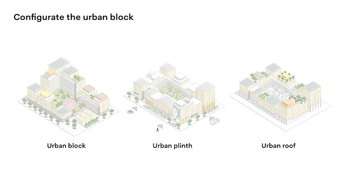 voor hybride stadsblokken opgebouwd uit torens, flats, rijhuizen en mini-blokken, gevormd rond een tiny forest, een plein of een binnentuin, met een multifunctionele plint en een duurzaam daklandschap”, stelt Marc Koehler Architects. “De onderste lagen zijn als prefab betonskelet gemaakt en de bovenste lagen van flexibel schakelbare houten modules. De verhouding tussen beton en hout wordt per project op maat gekozen.”