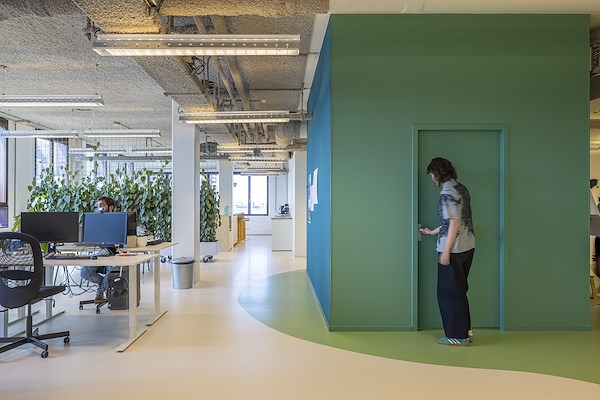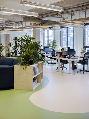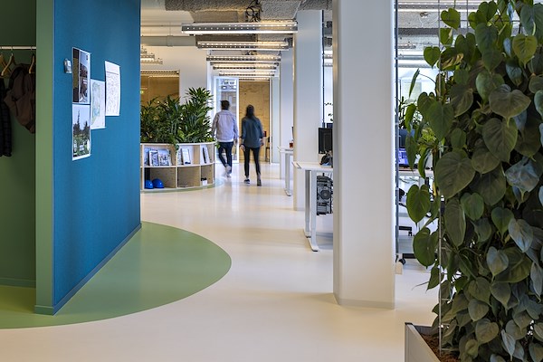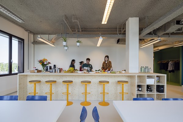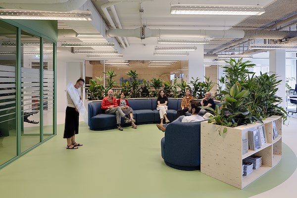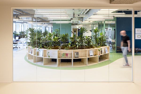 ingericht met veel beplanting rond de werkplekken. Hart van het kantoor vormt het zogeheten Happy Island, waar de medewerkers bij elkaar kunnen zitten, overleggen en presentaties houden.