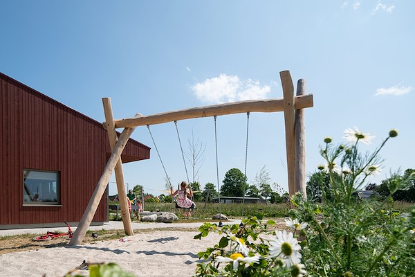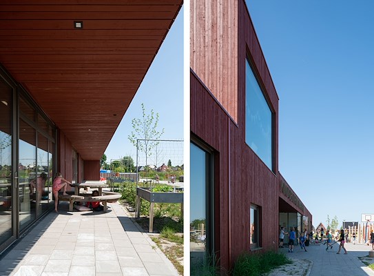 Het grote dakoverstek houdt in de zomer de zon buiten en zorgt het hele jaar door voor een grote buitenspeelplek met beschutting tegen regen of zon. Daarnaast voorziet het dak het interieur van een ruime hoogte en draagt het vele hout in het gebouw bij aan een aangenaam en rustig leer- en verblijfsklimaat.