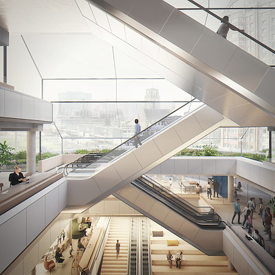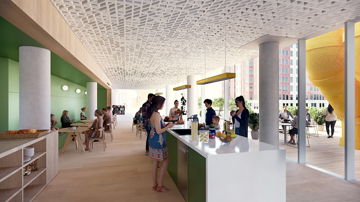 Belangrijke gebouwkenmerken zoals de gele buizen, glazen waterval en het blauwe magazijn blijven behouden en worden versterkt. De buizen orden ingezet als multifunctionele elementen en verlengd tot aan de grond. “Hierdoor worden ze onderdeel van het straatbeeld, tastbaar en benaderbaar, en nog meer onderdeel van de identiteit van het gebouw”, melden de architecten.