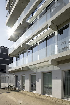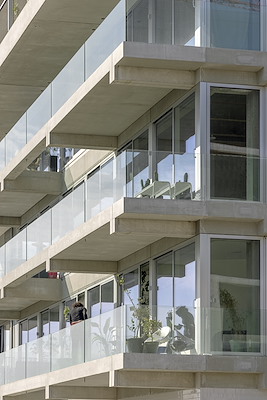 De twaalf appartementen hebben verschillende vormen en maten, met plattegronden die diep of breed zijn, of een combinatie van beide. De complexe 3D-puzzel die de inpassing van de woningen opleverde is niet zozeer afleesbaar aan het exterieur. De uitstraling hiervan wordt bepaald door de volledig beglaasde gevel, de royale balkons en materialen als beton en tegels.