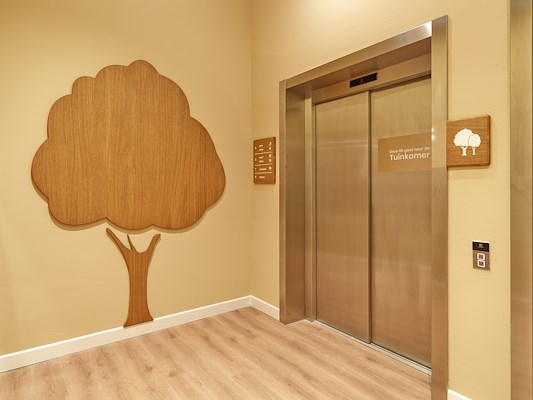 De gangen heeft sherylleysner laten voorzien van lambrisering; in de eerste plaats als praktische bescherming tegen karren en rollators en ten tweede als opdeling van de wanden. De klassieke uitstraling draagt bij aan een huiselijk gevoel. Leuningen stimuleren de bewoners om in beweging te komen. Aangezien de afstanden tussen de privékamers en de woonkamer relatief groot kunnen zijn, vormen de leuningen bovendien geen overbodige luxe. Uitgevoerd in naturel hout contrasteren ze met de kleur van de wanden, zodat de bewoners de leuningen intuïtief herkennen en gebruiken.