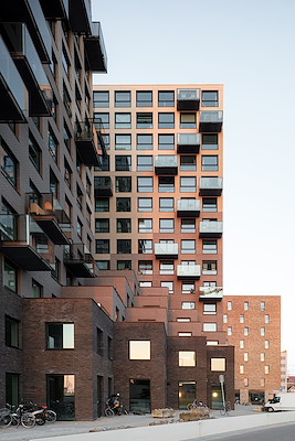De twee bewonersentrees zijn geheel omsloten met glazen wanden, waardoor de stenen wanden die naar binnen doorlopen ook te zien zijn vanaf de straat. De hoogwaardige bakstenen bestaan uit 152.685 ton speciaal geselecteerd en geüpcyclede baksteen, die het bureau in samenwerking met een duurzame baksteenproducent heeft ontwikkeld. In het gebouw is een deel van de stenen in een doorgezaagde versie toegepast, waarmee het sloopafval letterlijk zichtbaar wordt.