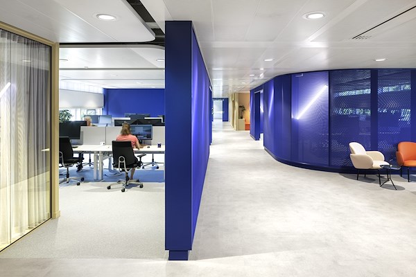 het interieur, waarin de ‘Media Flow’, zoals de serie diepblauwe wanden in het kantoor is genoemd, het organiserende element vormt.