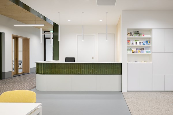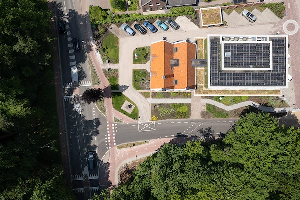 Een van de belangrijkste ontwerpkeuzes was het verplaatsen van het parkeren naar de achterzijde van het gebouw, meldt Zecc Architecten. Hierdoor kon het voorterrein groen worden ingericht en sluit deze beter aan op het bos aan de overkant van de straat. Het groen loopt over in de met sedum bedekte luifel, de groene gevel van de nieuwbouw en de groene accenten binnen. Door het verplaatsen van het parkeren is ook de verkeersveiligheid verbeterd.