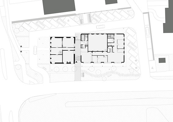 De nieuwbouw is verrezen op de plek van een van de latere aanbouwen van het rijksmonument, dat ooit is gebouwd als pastorie. Beide bouwdelen zijn verbonden door een nieuwe publieksentree, die tevens toegang biedt tot zowel het monument als de nieuwbouw. De entree is ontworpen als een transparante ‘wandelgang’. De klinkers van het pad dat ervoor ligt is doorgetrokken naar binnen, wat ook geldt voor de gevelafwerking van de naastgelegen bouwdelen.