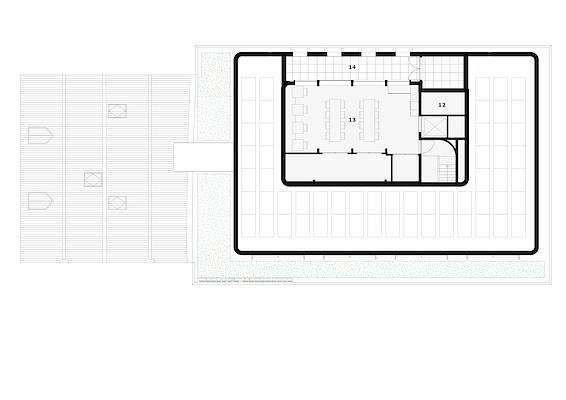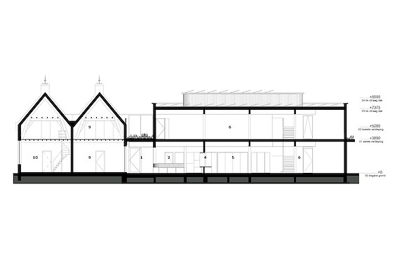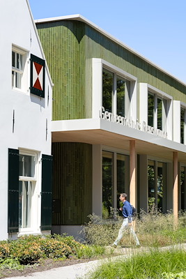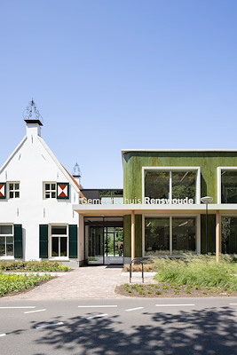 is de rijksmonumentale oudbouw uit 1651 gerestaureerd en verbonden met een nieuw volume. De tweelaagse nieuwbouw is geconstrueerd van CLT en heeft een keramische gevel van demontabele steenstrips met een groen glazuur uit afvalstromen van de glasindustrie.