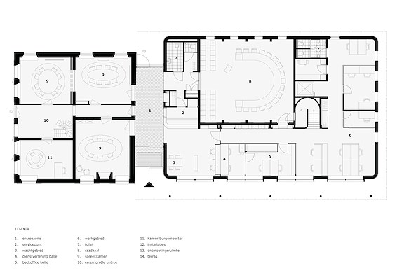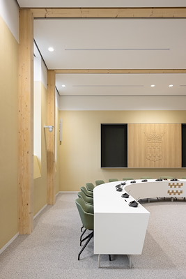 In de nieuwbouw zijn de raadszaal, publieksbalies en werkplekken voor de gemeenteambtenaren ondergebracht. Het monumentale deel biedt plek aan onder meer de trouwzaal, spreekkamers en burgemeesterskamer. In de materialisatie en uitstraling van de nieuwbouw wordt op verschillende manieren gerefereerd aan het monument. Zo verwijst de CLT-constructie, die binnen op meerdere plekken zichtbaar is, naar de houten kap op de verdieping van de oudbouw.