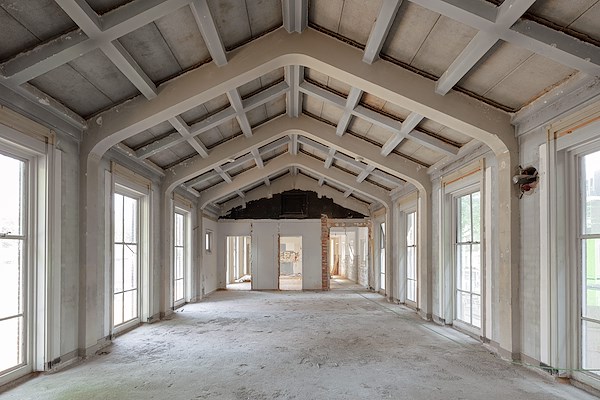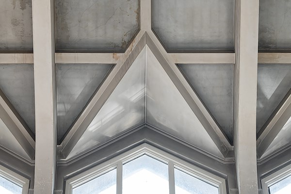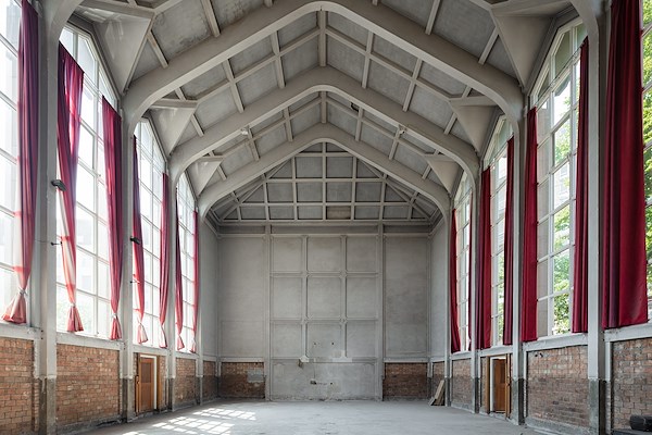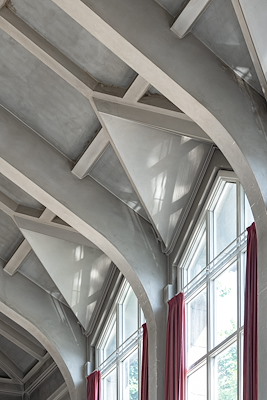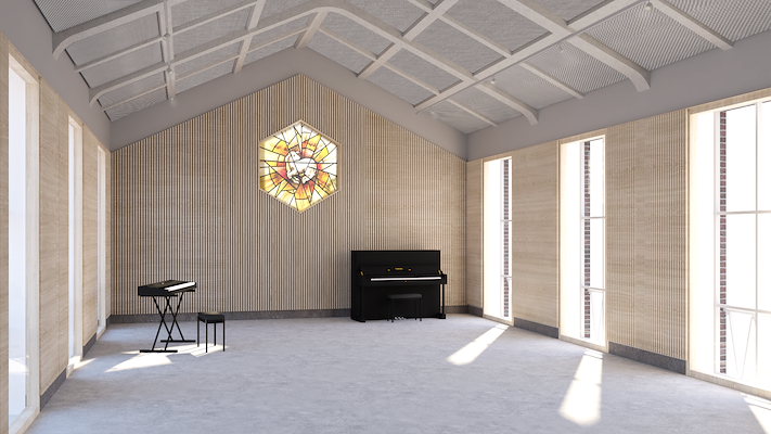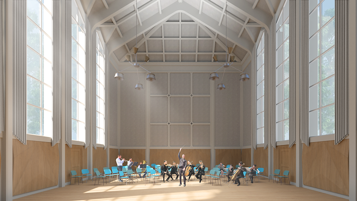 De gepleisterde betonconstructie – met een kenmerkend cassetteplafond – vormt de expressieve basis voor wat de grote muziekzaal gaat worden. Krachtige ornamenten krijgen een prominente plek. De opvallende kroonluchters worden hersteld en verlichten straks het plafond. Het indrukwekkende Flentrop-orgel uit 1954 blijft behouden en kan worden gebruikt door de jonge muzikanten.