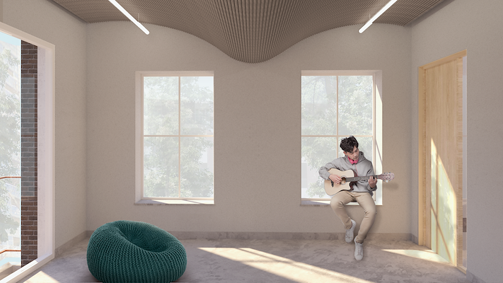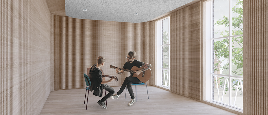 Met het oog op een goede akoestiek wordt muziekzaal voorzien van door Powerhouse Company ontworpen wandpanelen die met hun gefacetteerde oppervlak de geluidsgolven verstrooien. Verder worden in het bestaande cassetteplafond afwisselend absorptie- en laagfrequent-absorptiepanelen aangebracht. Speciale gordijnen zorgen voor zowel verbetering van de akoestiek als zonwering.