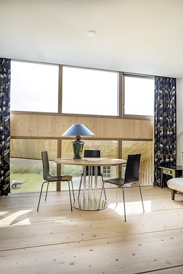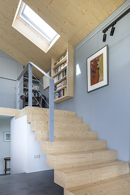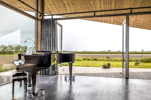 Een speciale wens van het stel was dat in de woonkamer ook concerten met publiek kunnen worden georganiseerd. Daarom is de leefruimte zo vrij mogelijk ontworpen, met vaste elementen zoals de keuken en de trap naar de verdieping zoveel mogelijk aan de zijkant. Door meubels te verplaatsen, kunnen de twee de ruimte geheel vrij maken en er stoelen voor het publiek neerzetten.