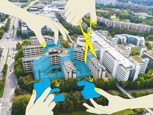 presenteren het voorlopig ontwerp voor het Fritz District in München. Een kolossaal, leegstaand kantoorgebouw wordt getransformeerd tot een stadswijk uit negen gebouwen en een gevarieerde openbare ruimte; Pool Architekten, Robertneun en MAD Arkitekter ontwerpen een deel van de gebouwen.