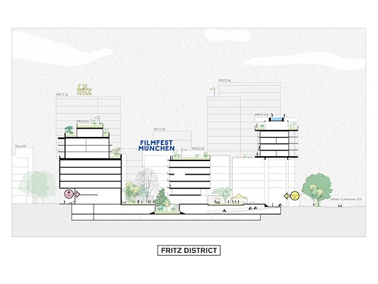 Met zijn hoogstedelijke dichtheid draagt het Fritz District bij aan de revitalisering van Neuperlach, een grootschalige stadsuitbreiding uit de jaren zestig van de vorige eeuw. Fritz District moet levendigheid brengen aan de stadsboulevard die aan de oostzijde is gepland. Hier komt ook de toegang tot een centrale fietsparkeergarage. Aan de noordzijde anticipeert het project op het afschalen van de autosnelweg, zodat daar een sportpark kan komen.