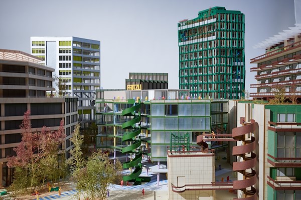 , het Fritz District. Door het bestaande gebouw zorgvuldig op te knippen, waarbij zo min mogelijk wordt gesloopt, ontstaan zeven gebouwen. Deze worden opgedikt en uitgebreid tot volumes die aan de hedendaagse wensen en eisen voldoen.
