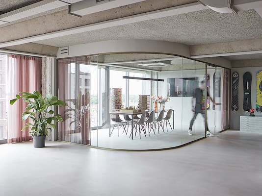heeft zijn intrek genomen in de optopping van het getransformeerde Veemgebouw in de Lichtstad. Het bureau ontwierp zelf het interieur van zijn verdieping in de dakopbouw van het complex. Met een aantal afgeronde prominente