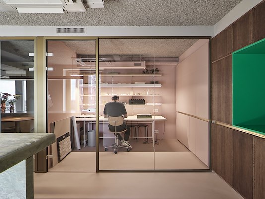Behalve de houten entreewand zijn de glazen vergaderruimte en bibliotheek voorzien van een ronde hoek. De vergaderruimte vormt een transparant element in het kantoor, maar kan indien gewenst of noodzakelijk worden afgesloten met een roze gordijn. Door de afgeronde kast met alle vakliteratuur van staal te maken, krijgt deze letterlijk het gewicht dat de inhoud verdient, aldus het bureau.