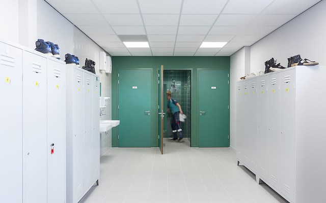 Al het personeel komt via de hoofdentree binnen en gaat direct naar boven. Het ambulancepersoneel kleedt zich hier om in de riante lockerrooms en gaat via de centrale trap weer naar beneden om de voertuigen te prepareren. Zo kunnen ambulances bij een noodgeval direct uitrijden. Voor het kantoorpersoneel liggen op de verdieping de ondersteunende werkplekken.