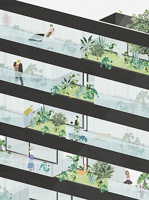“De verschillende groene ruimtes verleiden de bewoners om hun focus van binnen naar buiten te verschuiven”, legt associate Jurjen van der Horst uit, “Met als doel om een sterke binding met de flora en fauna van de stad en met de andere bewoners te bewerkstelligen.”