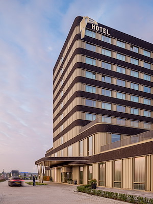 Wiegerinck heeft zich voor het ontwerp van het hotel laten inspireren door het polderlandschap, laat het bureau weten. De horizontaliteit van het landschap vertaalt zich in lange zichtlijnen en een gestapelde opbouw met donkere en lichte gevelbanden. “Door de lichte gevelbanden iets terug te leggen ten opzichte van de bakstenen ontstaat een bijzondere contrastwerking, terwijl aangename rondingen de organische vorm van het landschap benadrukken”, aldus het architectenbureau.