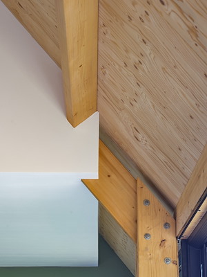 De door Jasper Smits ontworpen woning heeft een volledig houten constructie. De nok symboliseert de boerderijtypologie en geeft de ruimte extra hoogte. Dankzij een lichtstraat in het dak brengt de nok bovendien extra daglicht naar binnen. Centraal in de woonkamer staat een vrijstaand blok met daarin een toilet, garderobe, meterkast en keukenwand. Een trap leidt naar een werkruimte, die deels uitkraagt boven het keukendeel.
